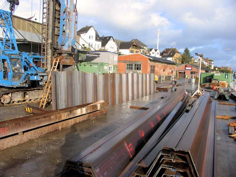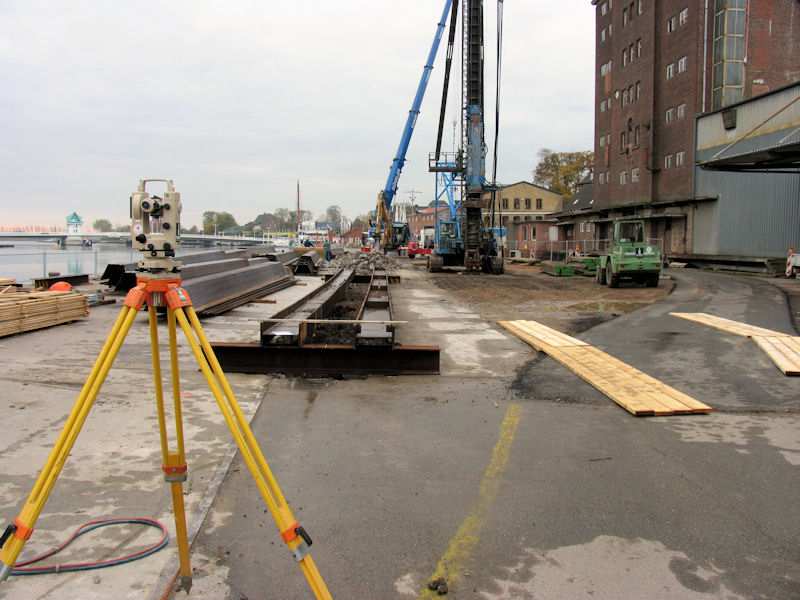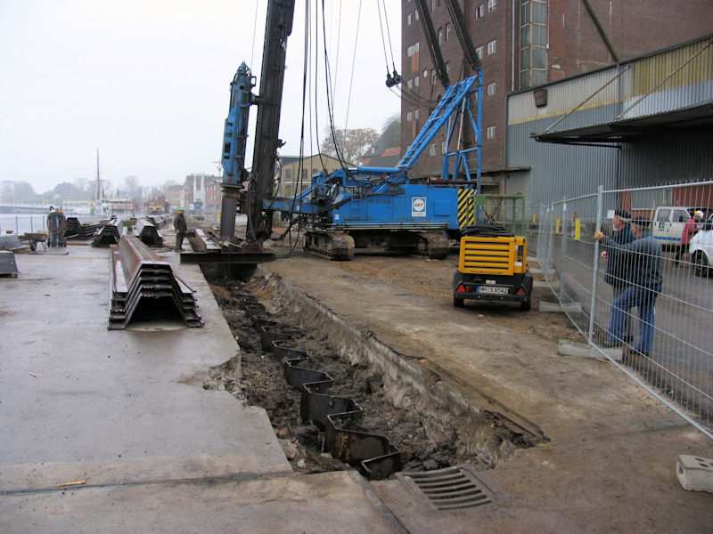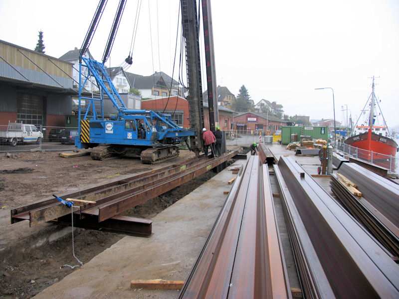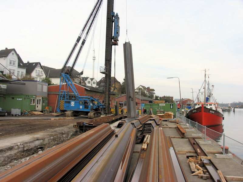 | 03.11.2004 - 11:34 Uhr - Kappeln/Schlei: Nordhafen Abriss Kaiplatte und Neubau Gastliegerhafen Kaiabschnitt 3: Abriss der Kaiplatte - Vorarbeiten Ansicht von Süden Die ersten eingerammten Spundwandbohlen Foto: Eckhard Schmidt - Kappeln - (C) 2004 |