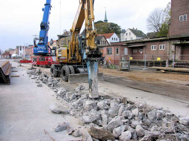 | 02.11.2004 - 11:32 Uhr - Kappeln/Schlei: Nordhafen Abriss Kaiplatte und Neubau Gastliegerhafen Kaiabschnitt 3: Abriss der Kaiplatte - Vorarbeiten Nordende der Kaiplatte Der Bagger ist dabei das letzte Stück des Rammschlitzes aufzustemmen. Jetzt müssen die Betonbrocken noch per LKW abgefahren werden. Foto: Eckhard Schmidt - Kappeln - (C) 2004 |
