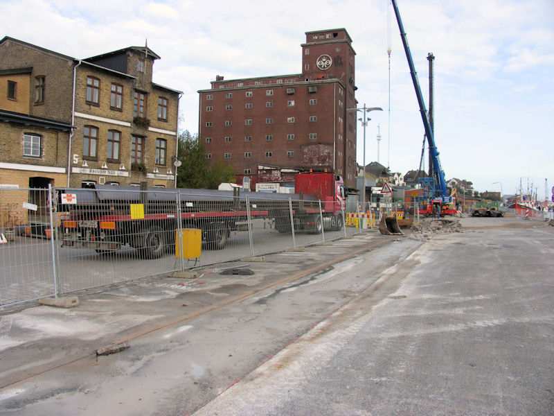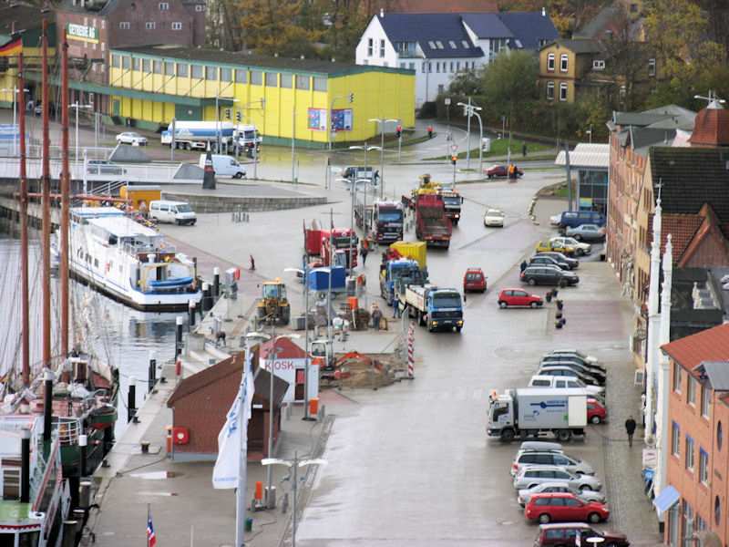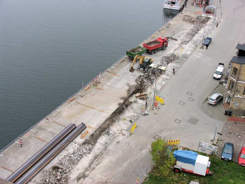 | 05.11.2004 - 11:29 Uhr - Kappeln/Schlei: Nordhafen Abriss Kaiplatte und Neubau Gastliegerhafen Kaiabschnitt 3: Abriss der Kaiplatte - Vorarbeiten Blick auf das Hafenvorfeld mit der Wassertreppe (links im Bild). Hier haben sich momentan einige LKWs geparkt die von der Baustelle kommen oder noch dorthin wollen. Foto: Eckhard Schmidt - Kappeln - (C) 2004 |