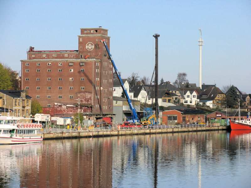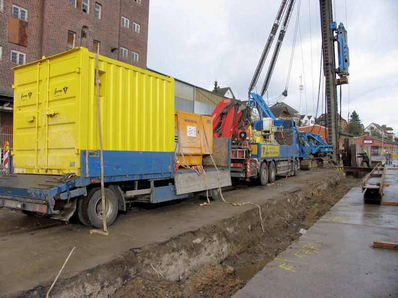| 05.11.2004 - 11:43 Uhr - Kappeln/Schlei: Nordhafen Abriss Kaiplatte und Neubau Gastliegerhafen Kaiabschnitt 3: Abriss der Kaiplatte - Vorarbeiten Die Firma Stump Spezialtiefbau bringt ihre Gerätschaften, um die Bohrlöcher für die GEWI-Pfähle der Spundwand zu erstellen, die Pfähle einzuführen und die Löcher mit Zement zu verpressen. Siehe auch obige Zeichnungen zum Gastliegerhafen. Foto: Eckhard Schmidt - Kappeln - (C) 2004 |