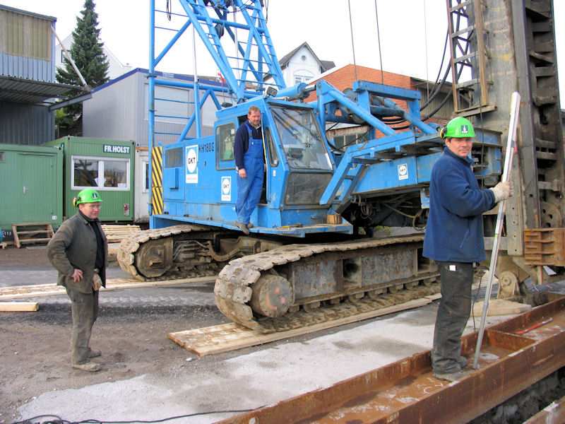 | 01.11.2004 - 15:02 Uhr - Kappeln/Schlei: Nordhafen Abriss Kaiplatte und Neubau Gastliegerhafen Kaiabschnitt 3: Abriss der Kaiplatte - Vorarbeiten Die Drei von der Ramme" von links nach rechts: Egbert Hess (FR. HOLST), Thomas Roloff (GKT -> Maschinenführer der Ramme) und Ronny Jeske (FR. HOLST) Foto: Eckhard Schmidt - Kappeln - (C) 2004 |