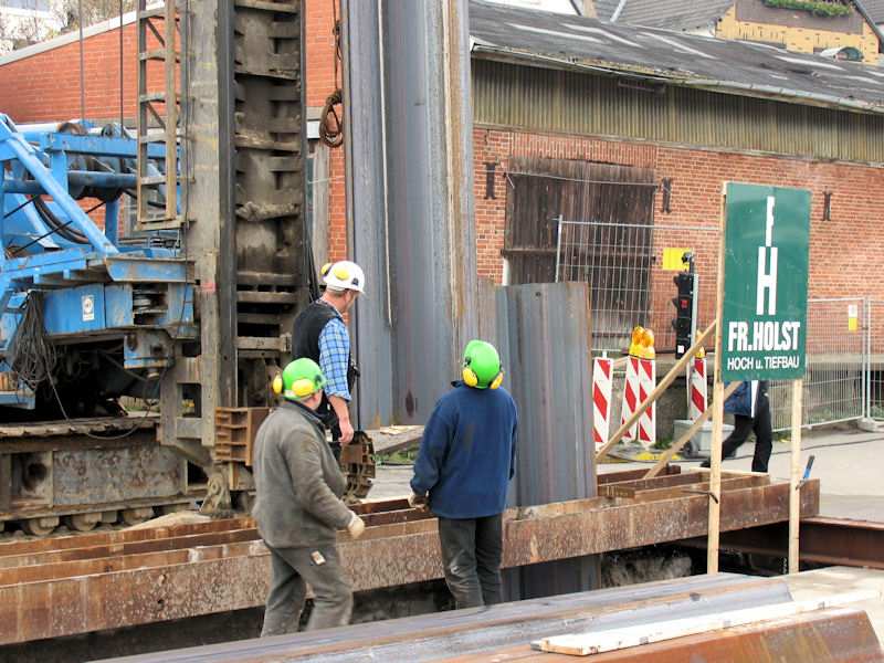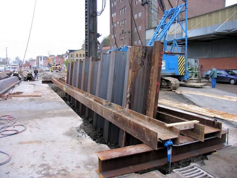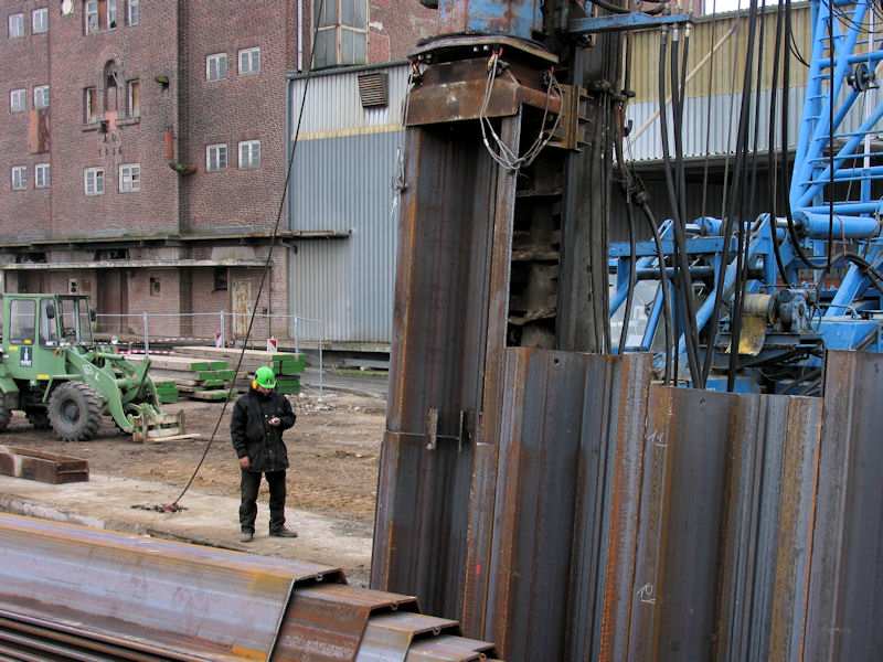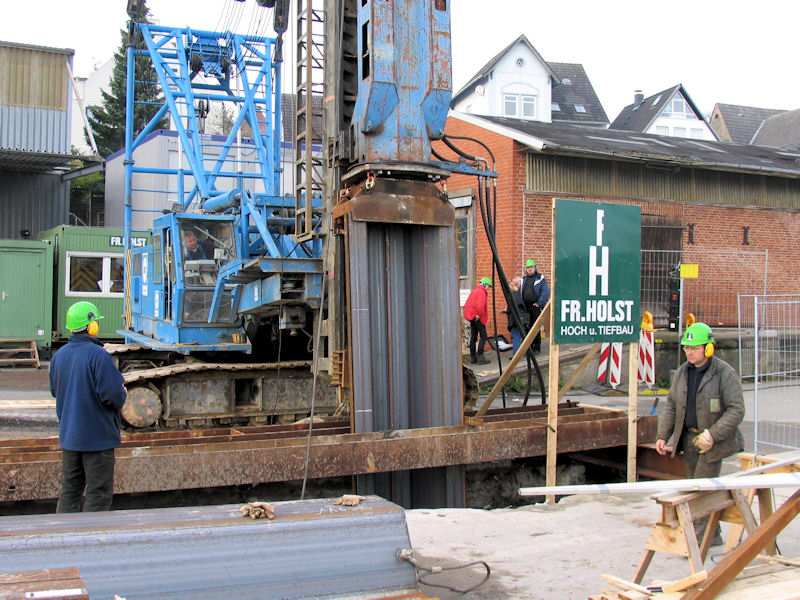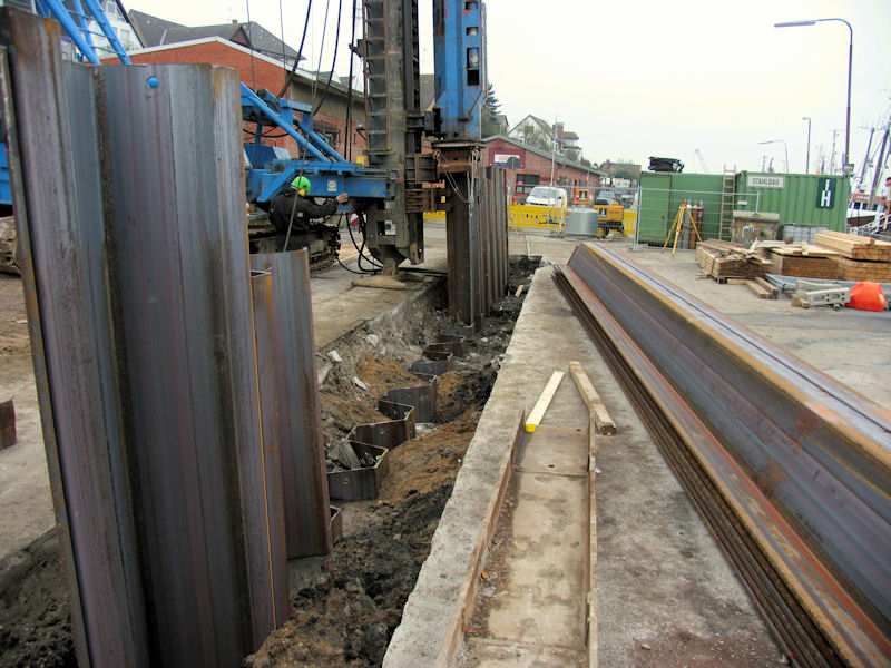 | 05.11.2004 - 11:27 Uhr - Kappeln/Schlei: Nordhafen Abriss Kaiplatte und Neubau Gastliegerhafen Kaiabschnitt 3: Abriss der Kaiplatte - Vorarbeiten Von den 26 Doppelbohlen sind bereits 12 Stück auf ihre endgültige Tiefe gerammt. Die rechten 14 Stück Bohlen müssen noch mit einem Adapter tiefer gerammt werden. Die Länge der bereits gerammten Spundwand beträgt -> 26 x 1,26 m = 32,76 m. (Gesamtlänge der Spundwand = 160 m) Foto: Eckhard Schmidt - Kappeln - (C) 2004 |