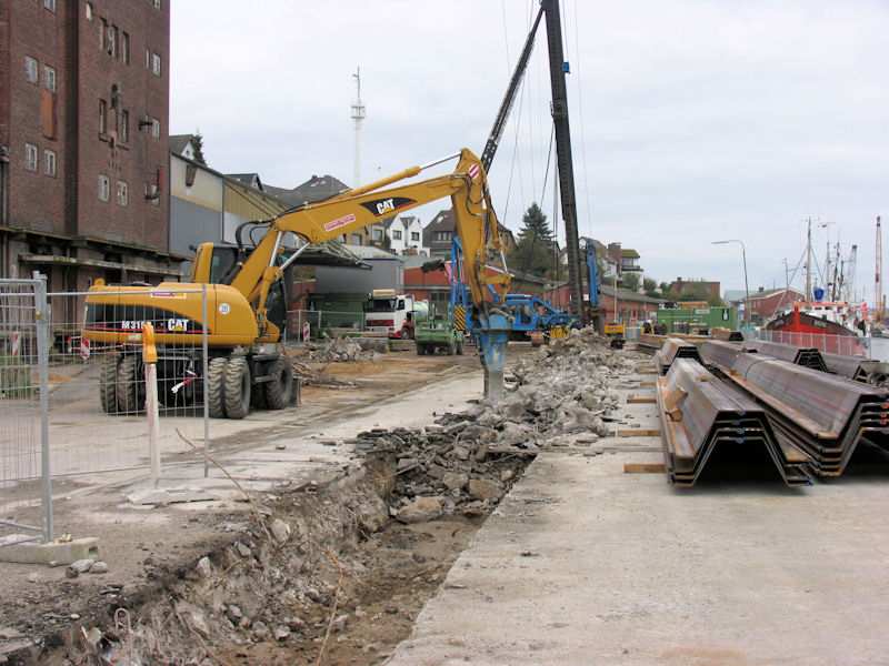 | 01.11.2004 - 11:32 Uhr - Kappeln/Schlei: Nordhafen Abriss Kaiplatte und Neubau Gastliegerhafen Kaiabschnitt 3: Abriss der Kaiplatte - Vorarbeiten Der Bagger ist am Nordende der Kaiplatte dabei den Rammschlitz weiter aufzustemmen. Links lagern die neu angelieferten Spundwandbohlen. Foto: Eckhard Schmidt - Kappeln - (C) 2004 |