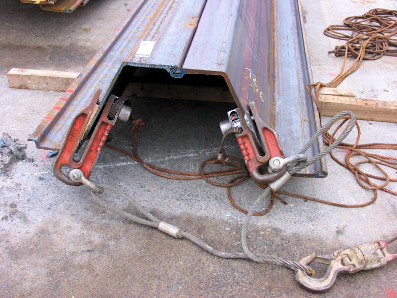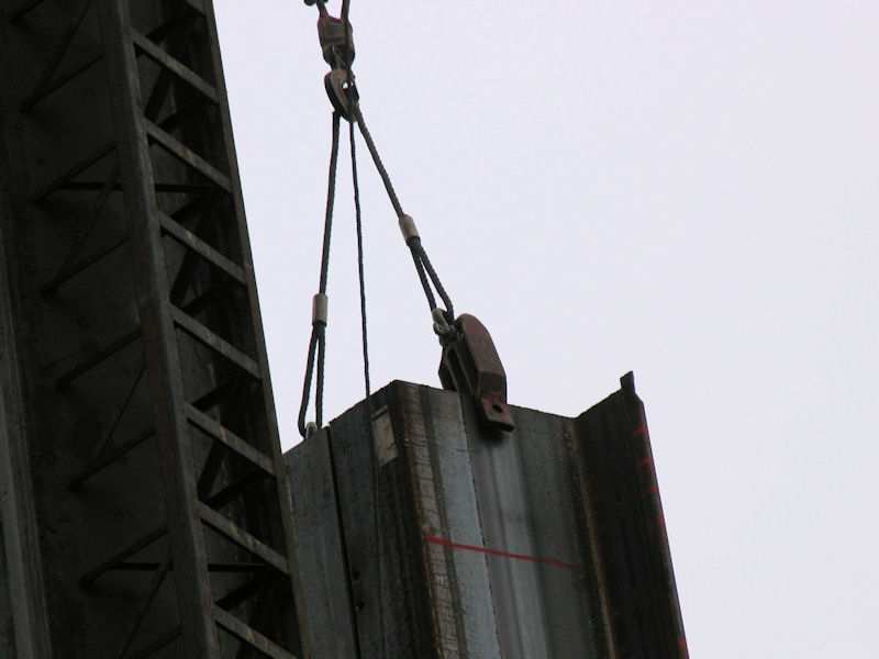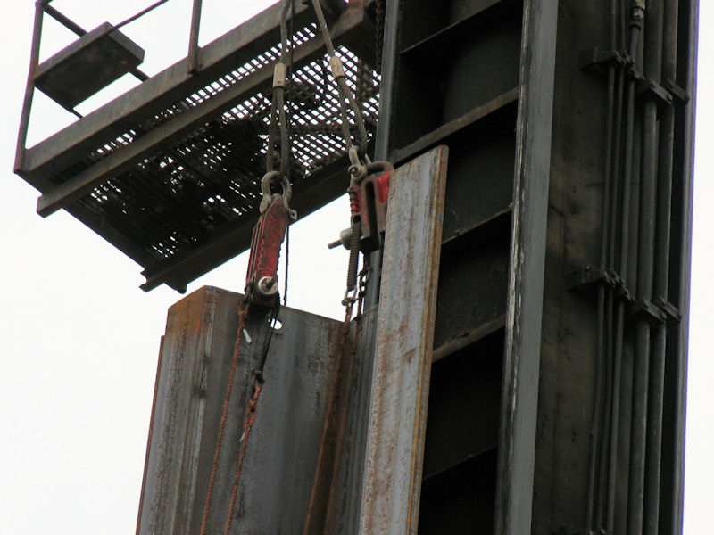 | 02.11.2004 - 11:39 Uhr - Kappeln/Schlei: Nordhafen Abriss Kaiplatte und Neubau Gastliegerhafen Kaiabschnitt 3: Abriss der Kaiplatte - Vorarbeiten Eine neue Spundwandbohle liegt bereit. Die beiden Robb-Schäkel zum Emporziehen der Bohle sind bereits angeschlagen. (Die Spezial-Schäkel wurden nach dem Hersteller benannt) Foto: Eckhard Schmidt - Kappeln - (C) 2004 |