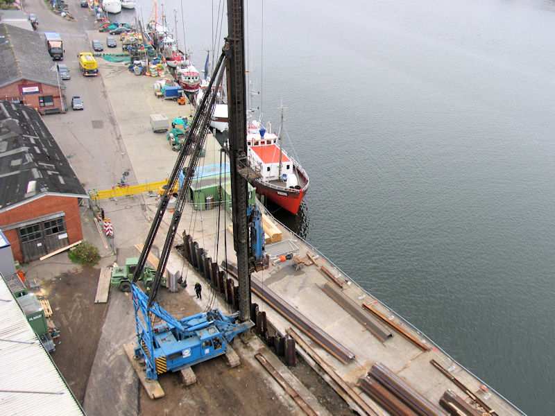 | 04.11.2004 - 11:41 Uhr - Kappeln/Schlei: Nordhafen Abriss Kaiplatte und Neubau Gastliegerhafen Kaiabschnitt 3: Abriss der Kaiplatte - Vorarbeiten Arbeiten am zweiten Rammabschnitt Ansicht von Südosten Foto: Eckhard Schmidt - Kappeln - (C) 2004 |