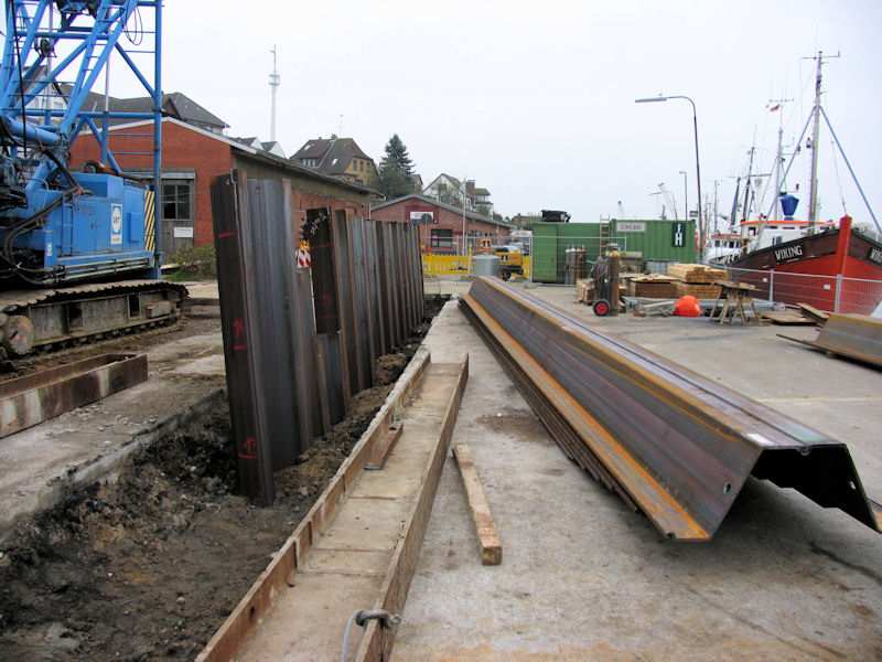 | 01.11.2004 - 11:18 Uhr - Kappeln/Schlei: Nordhafen Abriss Kaiplatte und Neubau Gastliegerhafen Kaiabschnitt 3: Abriss der Kaiplatte - Vorarbeiten Über dem Nordende des Rammschlitzes wird gerade die Rammführung aufgebaut. Im Hintergrund werden mit Hilfe eines Autokranes weitere Spundwandbohlen abgeladen. Kaiabschnitt 3 und 4: Baustellenschild -- Gastliegerhafen: Zeichnungen Regelquerschnitt der Kaiplatte vom Kaiabschnitt 3 Foto: Eckhard Schmidt - Kappeln - (C) 2004 |