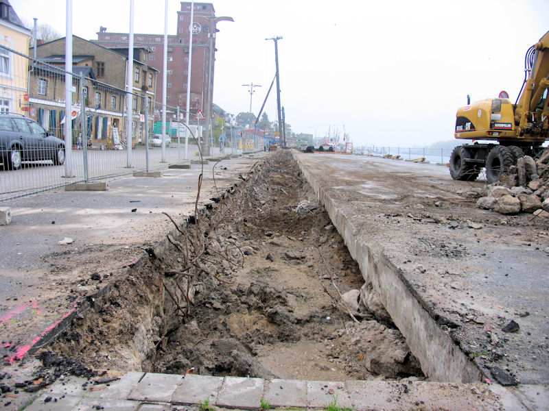 | 04.11.2004 - 11:34 Uhr - Kappeln/Schlei: Nordhafen Abriss Kaiplatte und Neubau Gastliegerhafen Kaiabschnitt 3: Abriss der Kaiplatte - Vorarbeiten Der Rammschlitz ist jetzt komplett fertig. Ansicht von Süden Foto: Eckhard Schmidt - Kappeln - (C) 2004 |