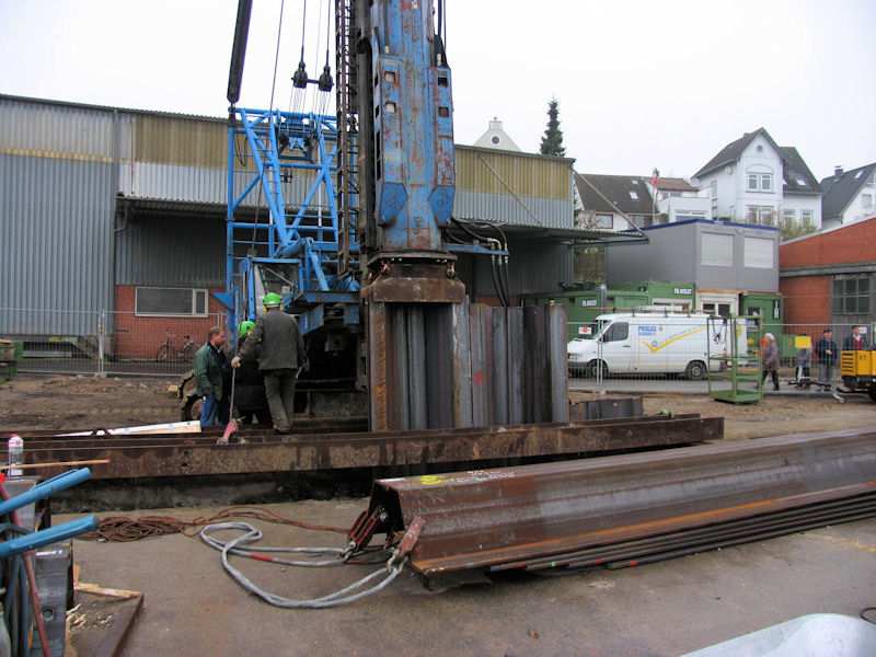 | 03.11.2004 - 14:47 Uhr - Kappeln/Schlei: Nordhafen Abriss Kaiplatte und Neubau Gastliegerhafen Kaiabschnitt 3: Abriss der Kaiplatte - Vorarbeiten Die Spundwandbohlen haben jetzt ihre endgültige Tiefe erreicht. Die vorderen werden später tiefer gerammt, wenn die nächsten Bohlen in meine Richtung gerammt sind. Foto: Eckhard Schmidt - Kappeln - (C) 2004 |