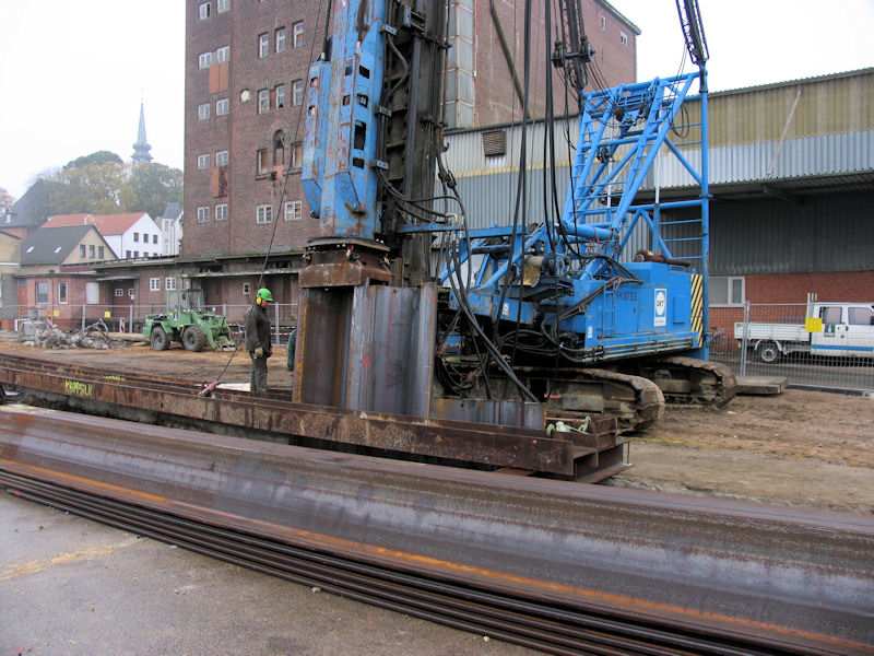 | 05.11.2004 - 11:56 Uhr - Kappeln/Schlei: Nordhafen Abriss Kaiplatte und Neubau Gastliegerhafen Kaiabschnitt 3: Abriss der Kaiplatte - Vorarbeiten Blick auf die gerammten Spundwandbohlen. Bei der Ramme wird gerade der Adapter befestigt, um die Bohlen noch tiefer rammen zu können. Foto: Eckhard Schmidt - Kappeln - (C) 2004 |