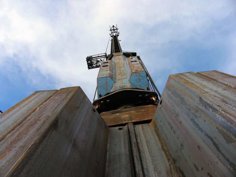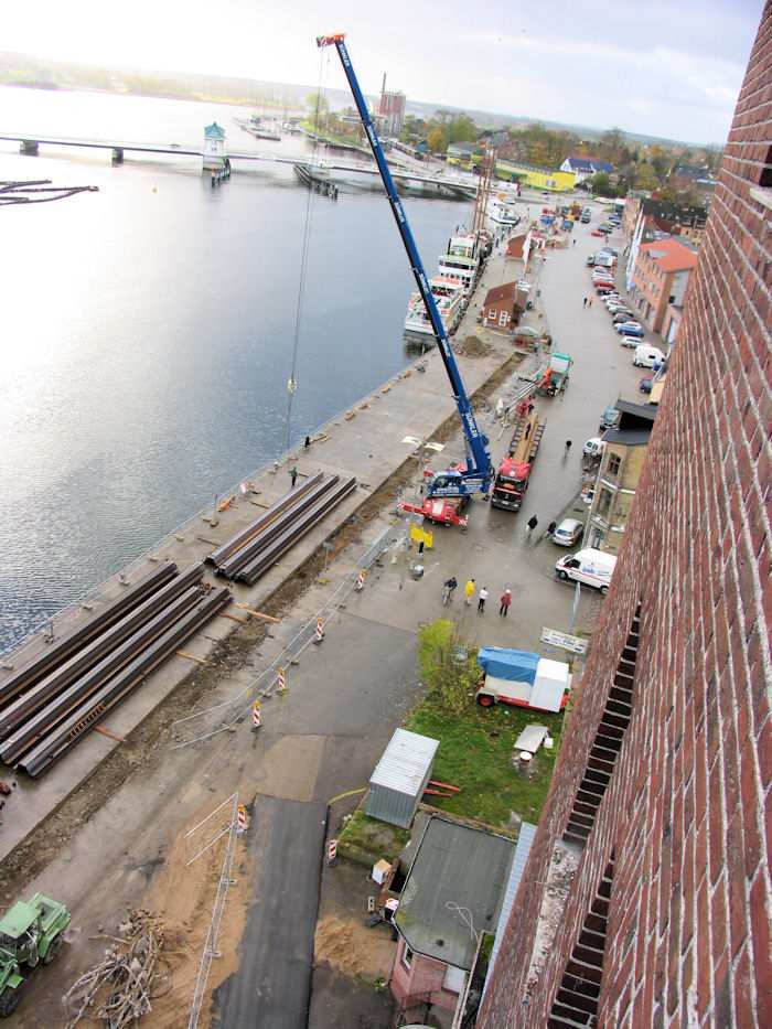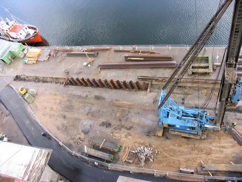 | 05.11.2004 - 11:54 Uhr - Kappeln/Schlei: Nordhafen Abriss Kaiplatte und Neubau Gastliegerhafen Kaiabschnitt 3: Abriss der Kaiplatte - Vorarbeiten Blick von unten auf die gerammten Spundwandbohlen und der Ramme mit dem Bär (blaues Teil) und dem 33 m hohen Mäkler. Foto: Eckhard Schmidt - Kappeln - (C) 2004 |