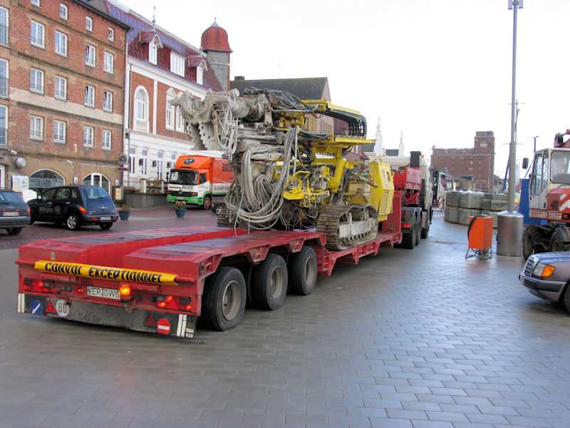 | 05.11.2004 - 12:36 Uhr - Kappeln/Schlei: Nordhafen Abriss Kaiplatte und Neubau Gastliegerhafen Kaiabschnitt 3: Abriss der Kaiplatte - Vorarbeiten Die Bohrmaschine für die Bohrung der Löcher der GEWI-Pfähle wartet noch auf einem Tieflader auf die Entladung. Foto: Eckhard Schmidt - Kappeln - (C) 2004 |