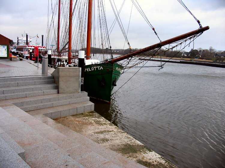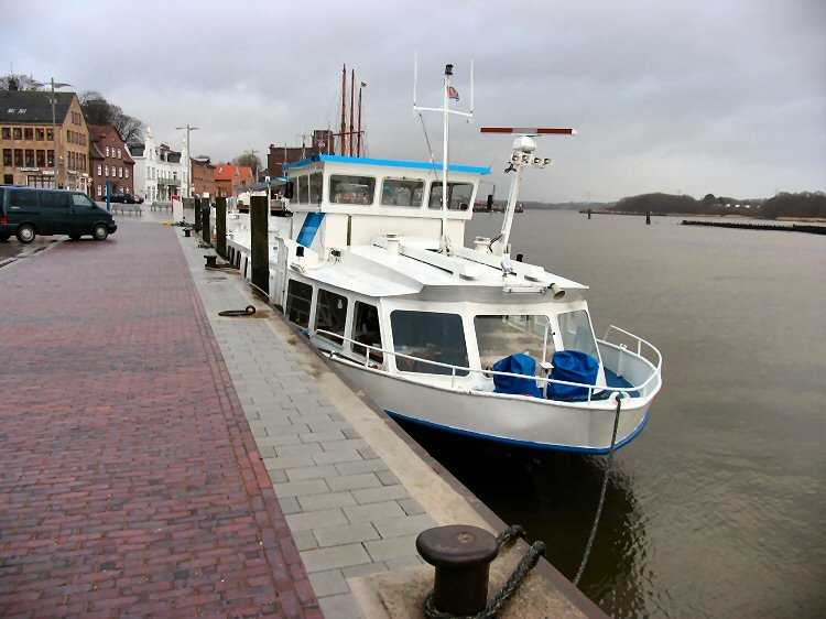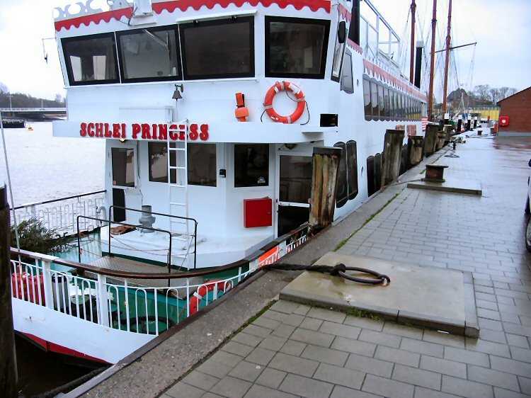 | 09.01.2004 - Kappeln/Schlei: Orkantief -> Niedrigwasser in der Schlei Die Gäste müssen heute zu der SCHLEI PRINCESS hinunter klettern. |