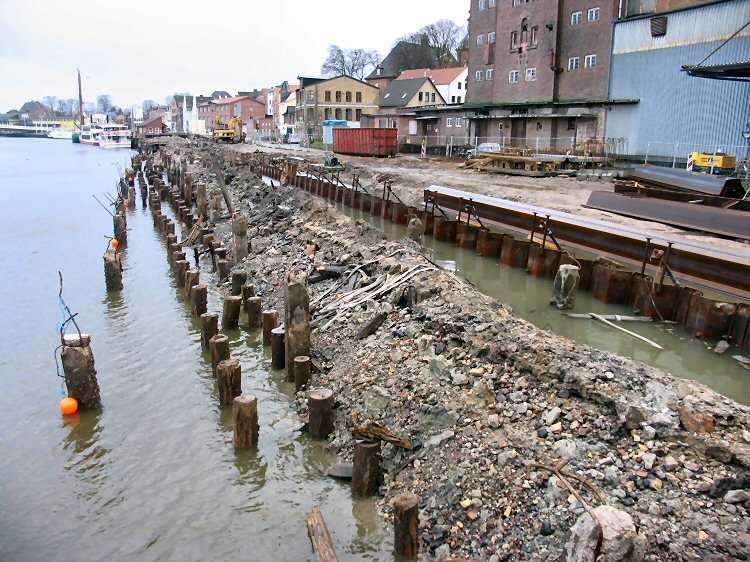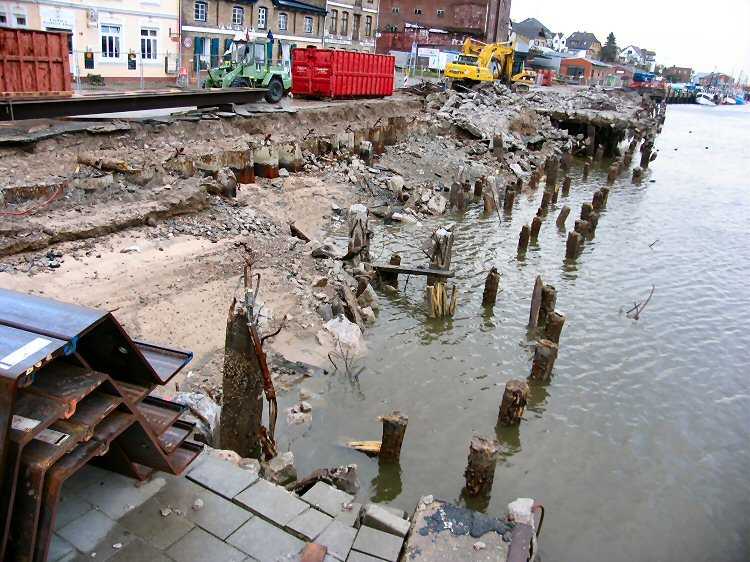 | 09.01.2004 - Kappeln/Schlei: Orkantief -> Niedrigwasser in der Schlei Auch die Baustelle des Tagesliegerhafens bietet heute einen etwas anderen Anblick. Blick von Süden auf die Baustelle. Heute sind auch gut die Holzpfähle der alten Kaianlage von 1904 gut zu erkennen. |