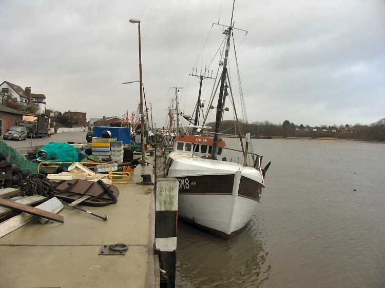 | 09.01.2004 - Kappeln/Schlei: Orkantief -> Niedrigwasser in der Schlei Der Fischkutter SM8 ADLER hat sich mit seinen Leinen an der Pier aufgehängt. |