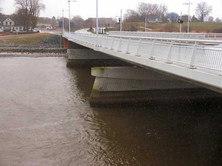 | 09.01.2004 - Kappeln/Schlei: Orkantief -> Niedrigwasser in der Schlei Auch die Brückenpfeiler der neuen Schleibrücke bieten heute einen etwas anderen Anblick. |