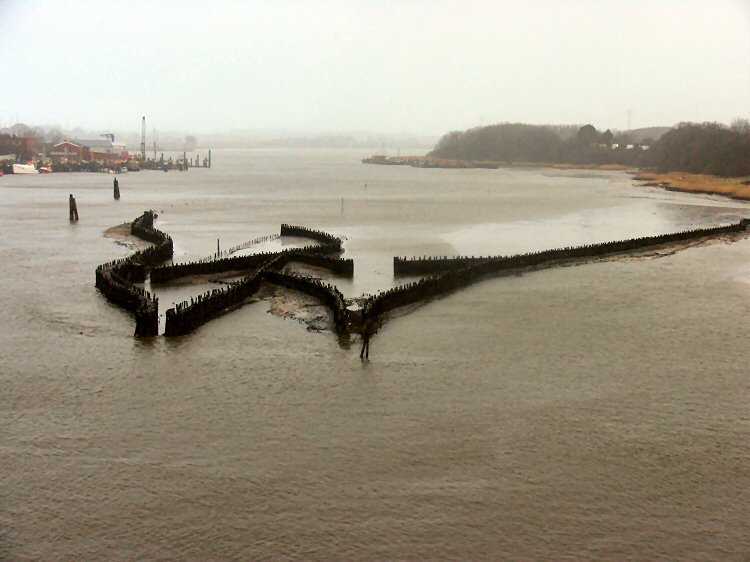 | 09.01.2004 - Kappeln/Schlei: Orkantief -> Niedrigwasser in der Schlei Auch der Heringszaun ist heute ziemlich trocken gefallen. Es geht gerade ein heftiger Regenschauer über Kappeln nieder. |