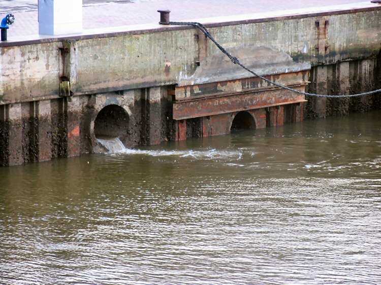 | 09.01.2004 - Kappeln/Schlei: Orkantief -> Niedrigwasser in der Schlei Zwei Regenwasserrohre auf der Kappelner Seite. Linkes Rohr: Von der B203 und der Schleibrücke Rechtes Rohr: Kommend vom Hohlweg. Dieses Rohr wurde im Rahmen der Umgestaltung des Hafenvorfeldes eingebaut. (Siehe auch entsprechende Foto-Beiträge im Jahre 2004) |
