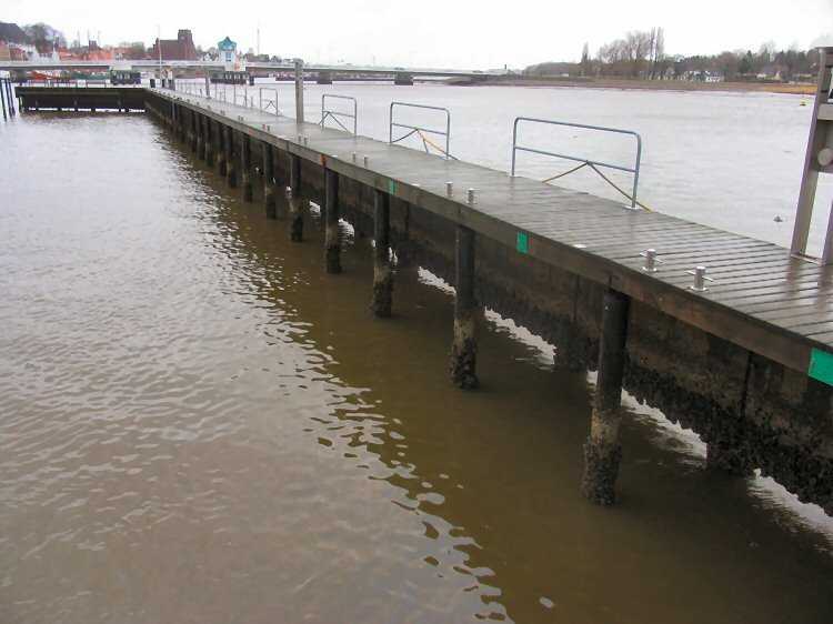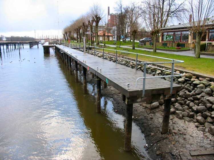 | 09.01.2004 - Kappeln/Schlei: Orkantief -> Niedrigwasser in der Schlei Auch der ASC-Yachthafen bietet heute einen etwas anderen Anblick. Das Bild zeigt die Innenbrücke im Bereich des Clubhauses. |