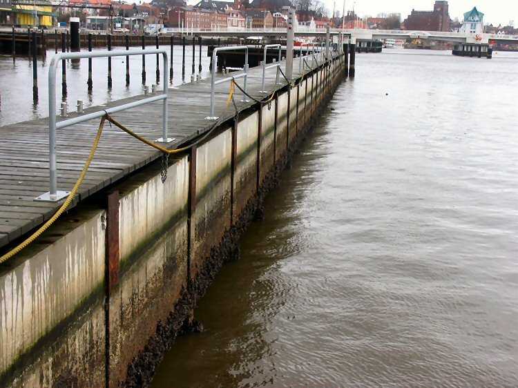 | 09.01.2004 - Kappeln/Schlei: Orkantief -> Niedrigwasser in der Schlei Die Schwallschutzwand an der Außenbrücke ist heute trocken gefallen. Man kann unter die Betonplatten hindurch schauen. |