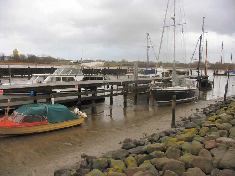 | 09.01.2004 - Kappeln/Schlei: Orkantief -> Niedrigwasser in der Schlei Das Orkantief hat in der Schlei für Niedrigwasser gesorgt. Momentan stürmt es nicht mehr so heftig, dafür sorgt ab und zu ein Regenschauer für Erfrischung. Der Wasserstand ist ca. 1 m gefallen. Die Boote und Schiffe im Nordhafen liegen jetzt etwas tiefer. Ein etwas anderer Anblick, man kann jetzt auf sie herunterschauen. |