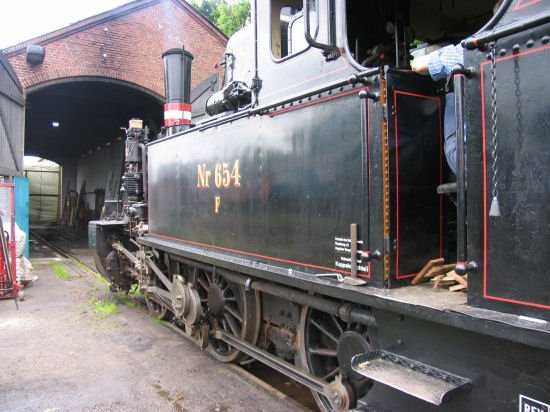 | 17.06.2005 - Kappeln/Schlei: Museumsbahnhof - Kleine Dampflok unter Dampf Blick in das Innere des Lokschuppens. Für die Prüfungen wird die Dampflok und der Wagen über die Arbeitsgrube gefahren werden. |