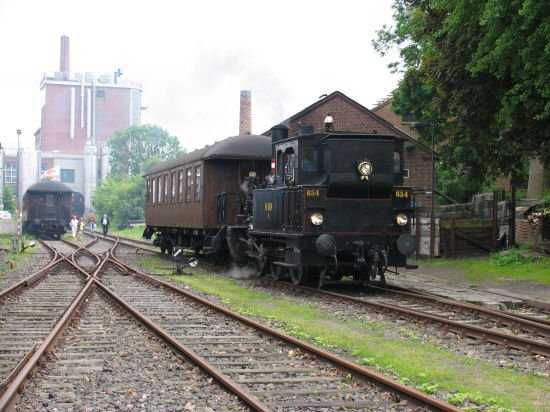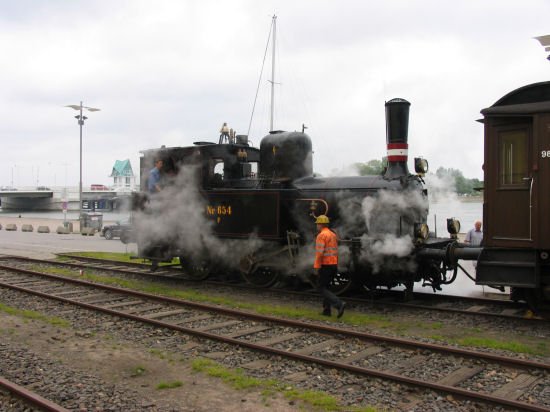 | 17.06.2005 - Kappeln/Schlei: Museumsbahnhof - Kleine Dampflok unter Dampf Der Wagen steht natürlich weiter hinten in der Reihe, daher sind einige Rangierarbeiten notwendig. |