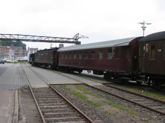 | 17.06.2005 - Kappeln/Schlei: Museumsbahnhof - Kleine Dampflok unter Dampf Die kleine Dampflok kommt jetzt mit dem vierten Wagen. Auf dem Gleis Nr. 2 sind auch noch zwei Wagen abgestellt. |
