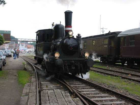 | 17.06.2005 - Kappeln/Schlei: Museumsbahnhof - Kleine Dampflok unter Dampf Die beiden anderen Loks stehen oben bei der Cremilk. Daten zu den Loks und Wagen siehe www.angelner-dampfeisenbahn.de. |