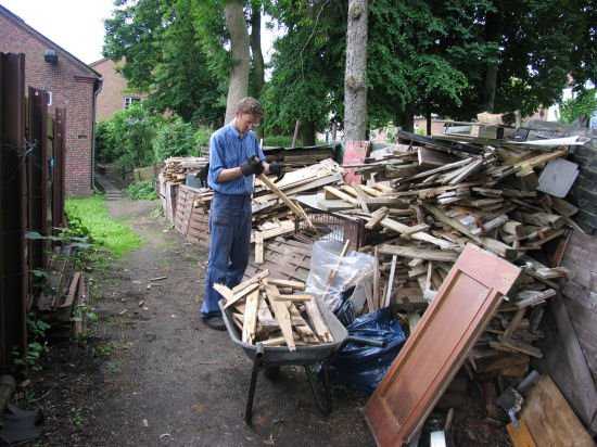 | 17.06.2005 - Kappeln/Schlei: Museumsbahnhof - Kleine Dampflok unter Dampf Während der Prüfung am Wagen ist Zeit neues Holz für die Dampflok zu holen. Das Holz stammt noch von der Baustelle des Hafenvorfeldes. Es ist das Verpackungsmaterial der chinesischen Granitstufen für die Wassertreppe. |
