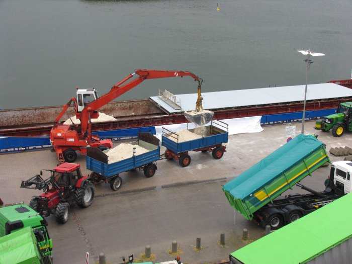 | 20.07.2005 - 10:24 Uhr - Kappeln/Schlei: Südhafen Einige Bauern holen ihren Kalk direkt selber am Schiff ab. Das erste Gespann bestehend aus einem Traktor mit zwei Anhängern ist gleich fertig beladen. Foto: Eckhard Schmidt - Kappeln - (C) 2005 |