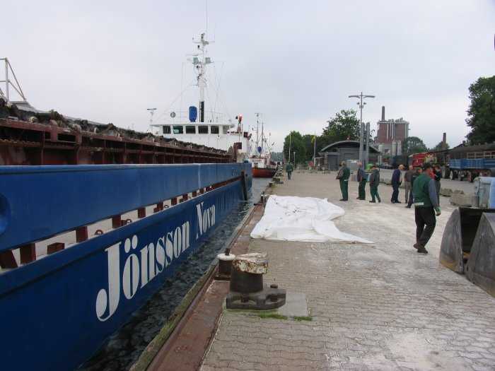 | 20.07.2005 - 10:13 Uhr - Kappeln/Schlei: Südhafen Die BARENTSZZEE hat jetzt an der Pier festgemacht. Der Bagger der Firma Ostseedienst aus Kappeln steht bereits zum Entladen des Schiffes. Die LKW haben ihre Hänger hochgestellt, damit das Regenwasser von den Planen ablaufen kann. Für den Beladevorgang mit Kalk werden die Planen seitlich eingerollt. Foto: Eckhard Schmidt - Kappeln - (C) 2005 |