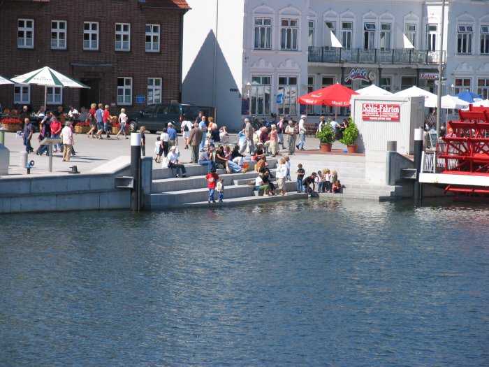 | 22.07.2005 - 14:36 Uhr - Kappeln/Schlei: Nordhafen - Wassertreppe Blick von der Schleibrücke auf die Wassertreppe. Früher befand sich hier der Pfeiler I der ehemaligen Drehbrücke. Im Rahmen der Umgestaltung des Hafenvorfeldes (2004) entstand hier eine Wassertreppe. Bei warmen Wetter kann man gut auf der Treppe Platz nehmen und das Treiben auf der Schlei und den Öffnungsvorgang der Schleibrücke beobachten. Foto: Eckhard Schmidt - Kappeln - (C) 2005 |