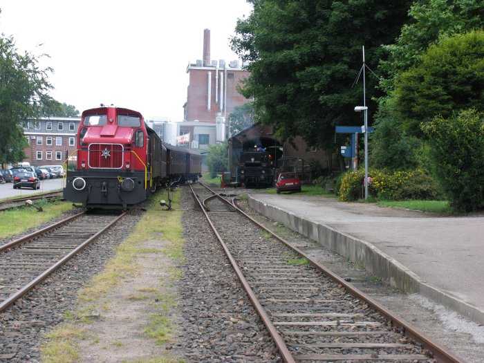 | 23.07.2005 - 12:18 Uhr - Kappeln/Schlei: Museumsbahnhof Die Museumsbahner sind dabei mit Hilfe ihrer Diesellok die Wagen für den morgigen Zug zusammenzustellen. Die kleine Dampflok F654 (rechts) wird schon mal für heute angeheizt. Heute am 23. Juli 2005 ist im Schlei-Boten folgender Artikel erschienen: Angelner Museumsbahn wieder unter Dampf Foto: Eckhard Schmidt - Kappeln - (C) 2005 |