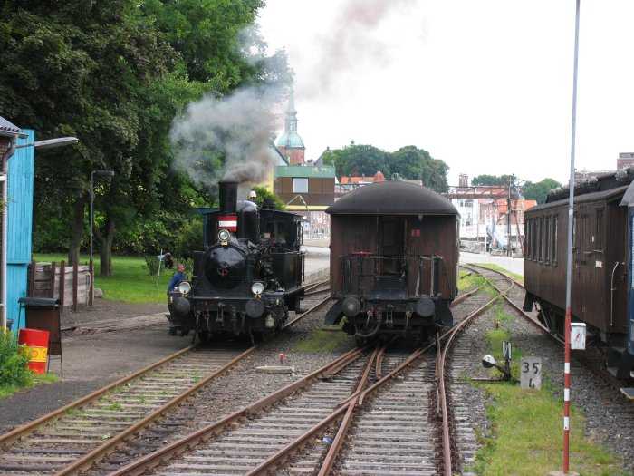 | 22.07.2005 - 8:05 Uhr - Kappeln/Schlei: Museumsbahnhof Die Diesel-Rangierlok hat die Rangier-Dampflok F654 aus dem Lokschuppen herausgezogen, damit diese angeheizt werden kann. Mit der kleinen Dampflok und einem Personenwagen soll heute Nachmittag die Strecke zwischen Kappeln und Süderbrarup abgefahren werden. Die Presse wird auch mitfahren. Am kommenden Sonntag um 11:00 Uhr soll ja der Betrieb auf der Strecke wieder aufgenommen werden. Foto: Eckhard Schmidt - Kappeln - (C) 2005 |