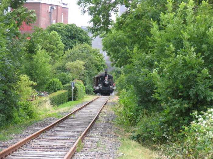 | 24.07.2005 - 11:04 Uhr - Kappeln/Schlei: Angelner Dampfeisenbahn Pünktlich um 11:00 Uhr hat sich der Zug in Kappeln in Bewegung gesetzt. Bei dem Cremilk-Werk wartet gleich die erste Steigung auf die kleine Dampflok. Langsam biegt der Zug beim Cremilk-Werk um die Kurve und nähert sich der 1. Straßenkreuzung Arnisser Straße. Foto: Eckhard Schmidt - Kappeln - (C) 2005 |
