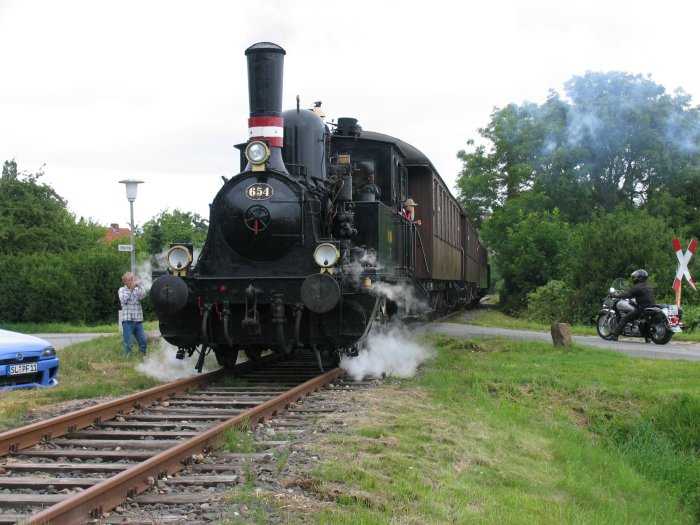 | 24.07.2005 - 11:06:04 Uhr - Kappeln/Schlei: Angelner Dampfeisenbahn Die kleine Dampflok F654 hat jetzt die Straßenkreuzung passiert. Der ganze Zug besteht aus der Lok, 3 Stück Personenwagen und einem offenen Güterwagen zum Transport von Fahrrädern. Foto: Eckhard Schmidt - Kappeln - (C) 2005 |