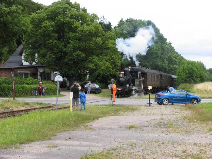 | 24.07.2005 - 14:07 Uhr - Kappeln/Schlei: Angelner Dampfeisenbahn Ich stehe an der Bahnkreuzung in Grödersby. Früher (bis 1972) befand sich hier der Bahnhof von Grödersby. Die Museumsbahn hat pünktlich um 14:00 Uhr in Kappeln den Bahnhof zu ihrer zweiten und heutigen letzten Tagesfahrt in Richtung Süderbrarup verlassen. Langsam nähert sich der Zug dem ehemaligen Bahnhof in Grödersby. Während meiner Lehrzeit bin ich von Grödersby einmal pro Woche mit der Schleswiger Kreisbahn nach Schleswig zur Berufsschule gefahren. Foto: Eckhard Schmidt - Kappeln - (C) 2005 |
