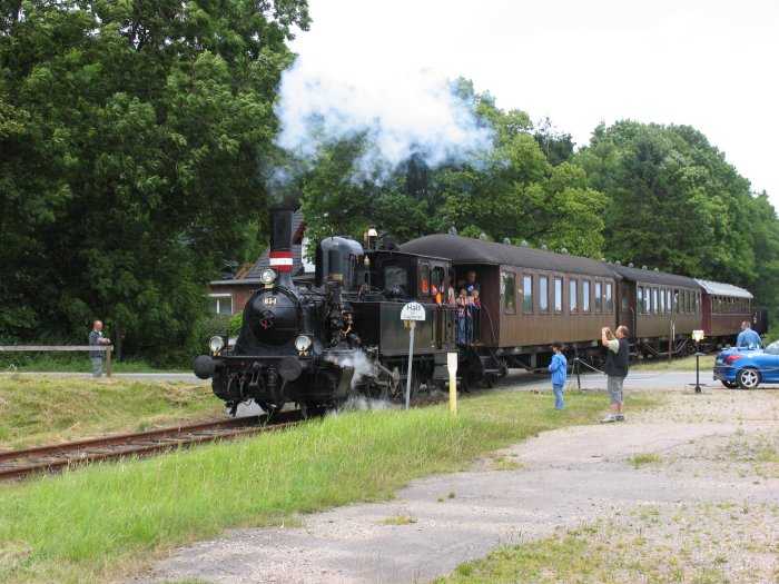 | 24.07.2005 - 14:10 Uhr - Kappeln/Schlei: Angelner Dampfeisenbahn Der Zug entschwindet langsam in Richtung Süderbrarup. Bis Faulück muss er noch eine Steigung überwinden. Foto: Eckhard Schmidt - Kappeln - (C) 2005 |