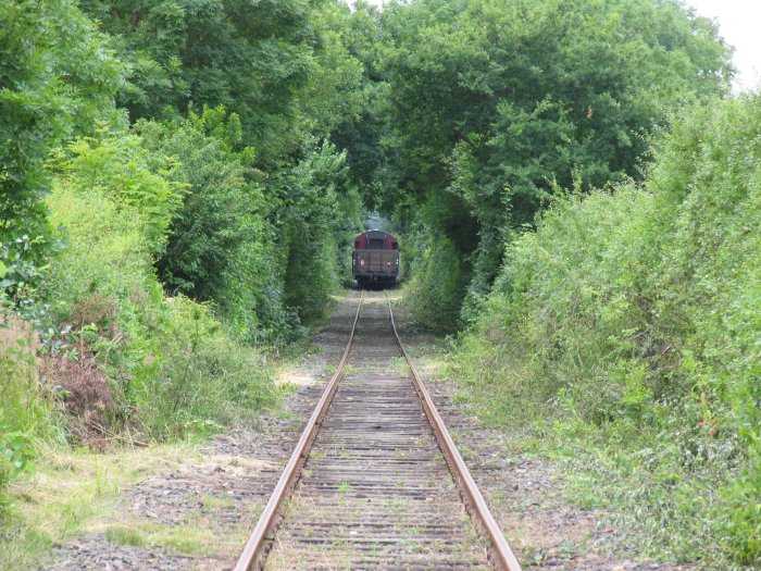 | 24.07.2005 - 14:10 Uhr - Kappeln/Schlei: Angelner Dampfeisenbahn Der Zug wird mit zunehmender Entfernung kleiner und kleiner. Er verschwindet regelrecht in einem grünen Tunnel aus Gebüsch und Bäumen. Foto: Eckhard Schmidt - Kappeln - (C) 2005 |