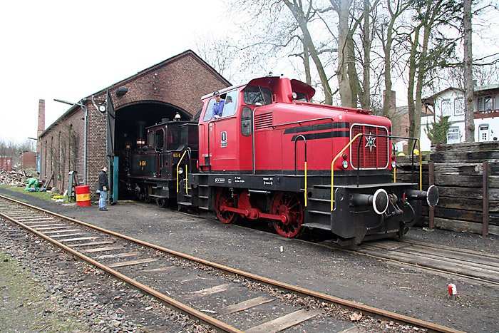 | 08.04.2006 - 10:10 Uhr - Kappeln/Schlei: Angelner-Dampfeisenbahn Die Diesellok Zucker-Susi" zieht gerade die kleine Dampflok Julchen" aus dem Lokschuppen heraus. Foto: Eckhard Schmidt - Kappeln - (C) 2006 |