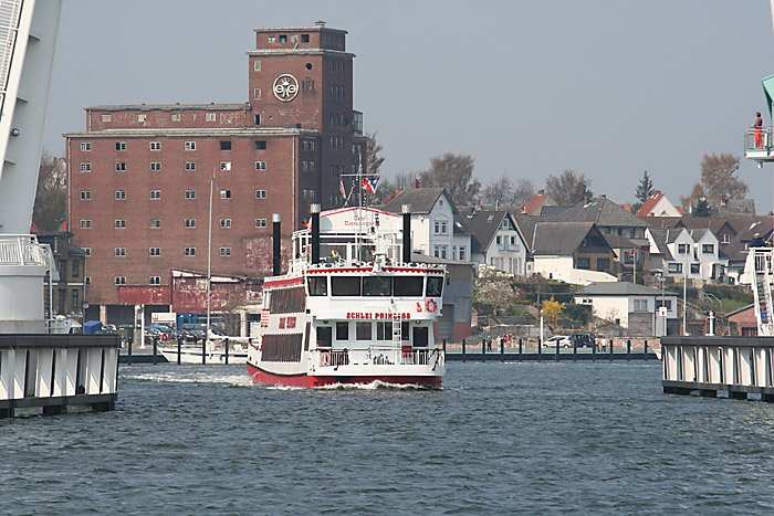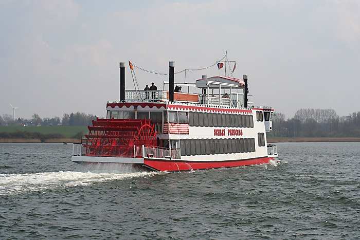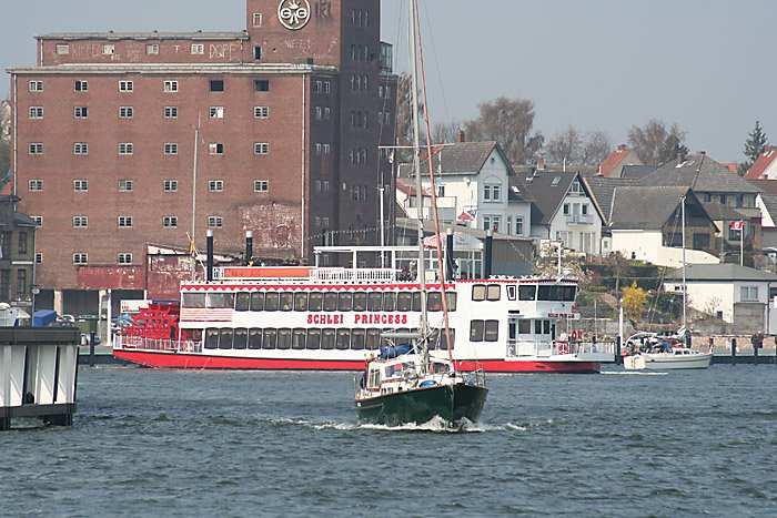 | 01.05.2006 - 14:57 Uhr - Kappeln/Schlei: Brückenöffnung 14:45 Uhr - keine Vorkommnisse Die Schlei Princess" auf dem Weg in Richtung Arnis. Angetrieben wird das Schiff durch das hintere Schaufelrad. Darunter befindet sich kein zusätzlicher Schiffspropeller. Nur im Vorschiff hat die Schlei Princess" noch ein Bugstrahlruder. Foto: Eckhard Schmidt - Kappeln - (C) 2006 |