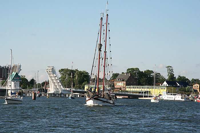 | 05.08.2006 - 18:52 Uhr - Kappeln/Schlei: Einlaufen der MAGDA D Vorsichtig nähert sich die MAGDA D der Schleibrücke. Foto: Eckhard Schmidt - Kappeln - (C) 2006 |