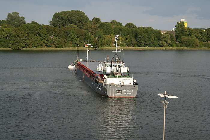 | 05.08.2006 - 18:49 Uhr - Kappeln/Schlei: Einlaufen der MAGDA D Von Norden her nähert sich das Frachtschiff MAGDA D der Schleibrücke. Heimathafen: St. John´s, Land: Antigua Das Schiff hat dänischen Kalk geladen. Die Ladung ist für die Getreide AG in Kappeln bestimmt. Die Ladung soll am Montag gelöscht werden. Foto: Eckhard Schmidt - Kappeln - (C) 2006 |