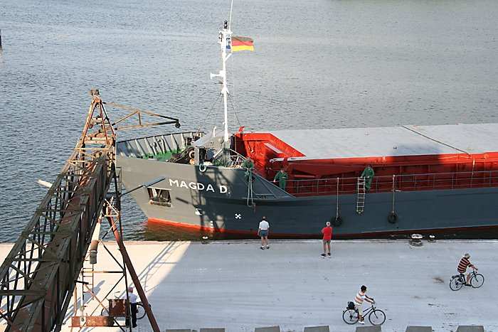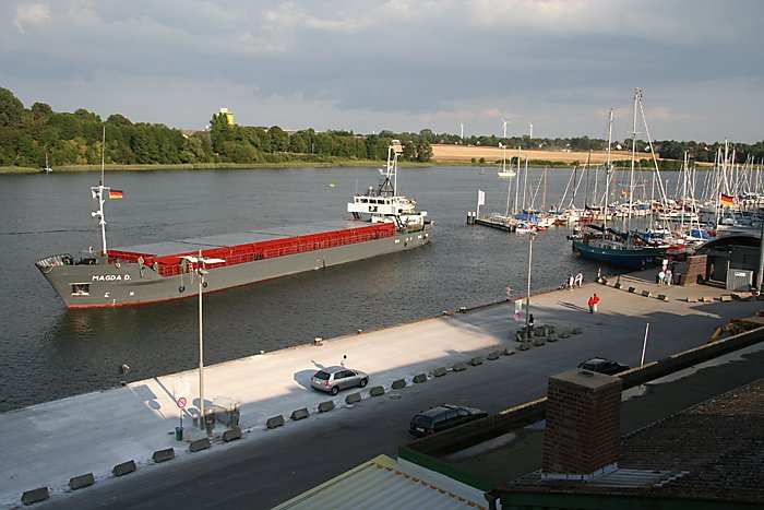 | 05.08.2006 - 18:56 Uhr - Kappeln/Schlei: Einlaufen der MAGDA D Mit Hilfe des Bugstrahlruders ist das Drehen auf der Stelle kein Problem. Foto: Eckhard Schmidt - Kappeln - (C) 2006 |