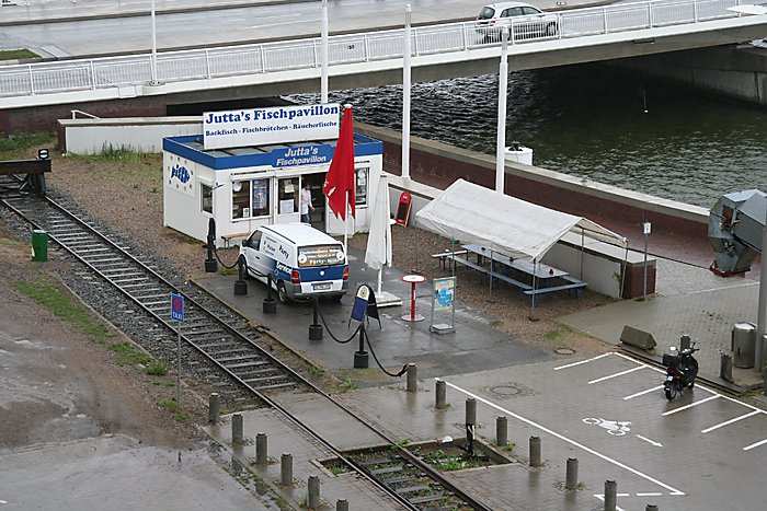 | 14.08.2006 - 14:47 Uhr - Kappeln/Schlei: Jutta´s Fischpavillon Blick von oben auf Jutta´s Fischpavillon. Die Sonnenschirme sind wegen dem Wind zusammengeklappt. Foto: Eckhard Schmidt - Kappeln - (C) 2006 |