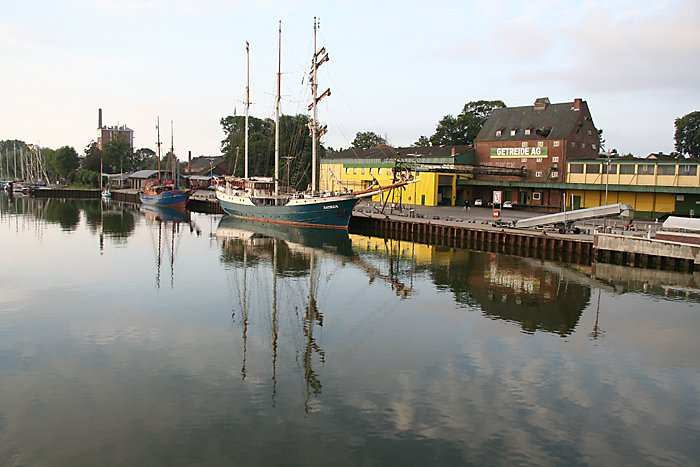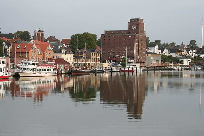 | 27.09.2006 - 8:29 Uhr - Kappeln/Schlei: Nordhafen Blick von der Schleibrücke in Richtung Nordhafen. Rechts im Bild der Gastliegerhafen mit dem GAG-Silo aus dem Jahre 1936. Foto: Eckhard Schmidt - Kappeln - (C) 2006 |