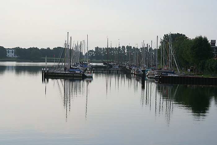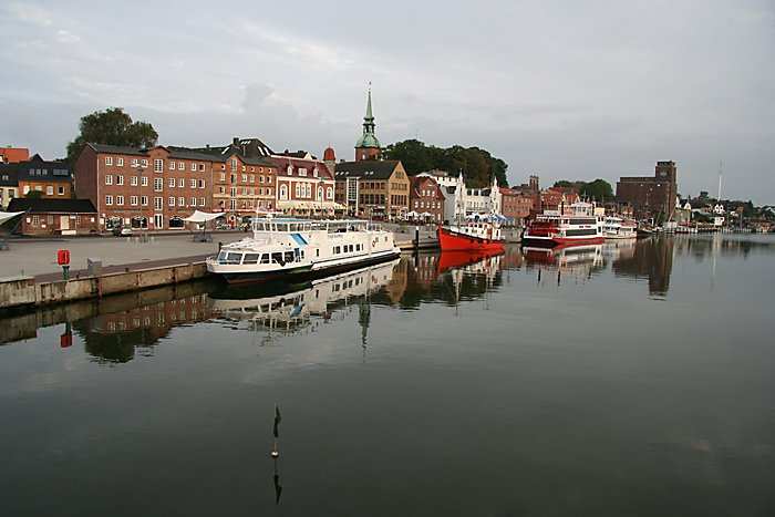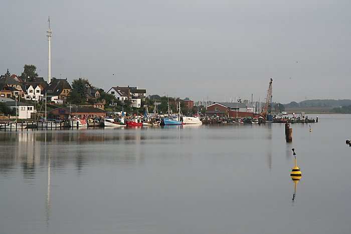 | 27.09.2006 - 8:27 Uhr - Kappeln/Schlei: Nordhafen Blick von der Schleibrücke in Richtung Nordhafen. Hier haben die Kappelner Fahrgastschiffe und ein Angelkutter festgemacht. Foto: Eckhard Schmidt - Kappeln - (C) 2006 |
