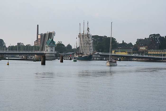 | 27.09.2006 - 8:51 Uhr - Kappeln/Schlei: Nordhafen Der holländische Traditionssegler ANTIGUA passiert gerade die Schleibrücke in Richtung Ostsee. Foto: Eckhard Schmidt - Kappeln - (C) 2006 |