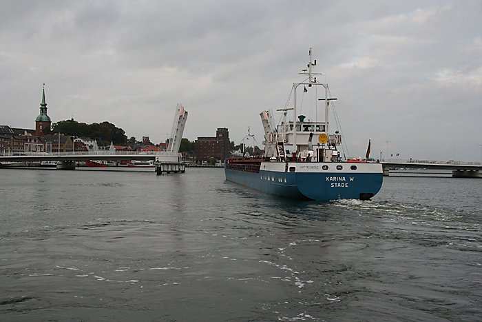| 23.10.2006 - 16:51 Uhr - Kappeln/Schlei: Südhafen - Auslaufen der KARINA W Die KARINA W hat die Schleibrücke passiert und nimmt Kurs in Richtung Ostsee. Foto: Eckhard Schmidt - Kappeln - (C) 2006 |