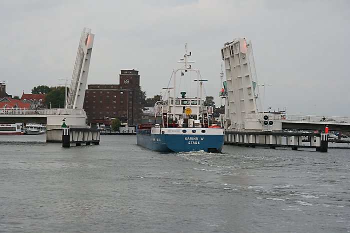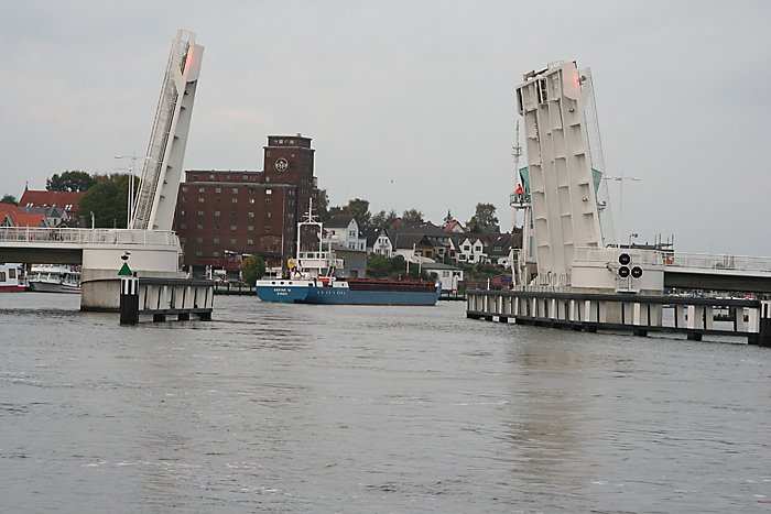 | 23.10.2006 - 16:47 Uhr - Kappeln/Schlei: Südhafen - Auslaufen der KARINA W Die KARINA W liegt jetzt direkt vor der Brückeneinfahrt. Die Brückenklappen werden gerade geöffnet. Foto: Eckhard Schmidt - Kappeln - (C) 2006 |